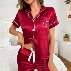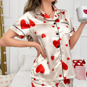 Pijama satinada con pantalon corto y estampado de corazones
